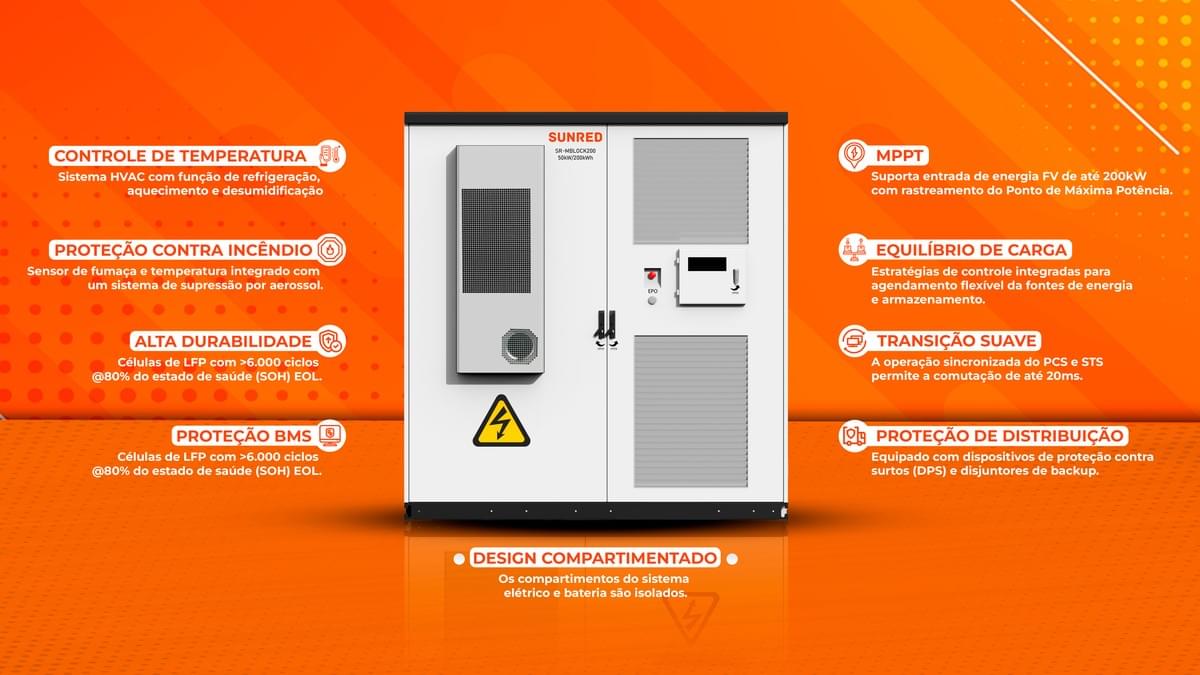 O produto C&I BESS SR-BLOCK200-HF é um sistema de armazenamento de energia especialmente projetado para microrredes regionais, como pequenos CBDs, fazendas, ilhas, usinas fotovoltaicas externas e entre outros locais, podendo garantir totalmente a demanda de energia e a segurança energética nesses locais.